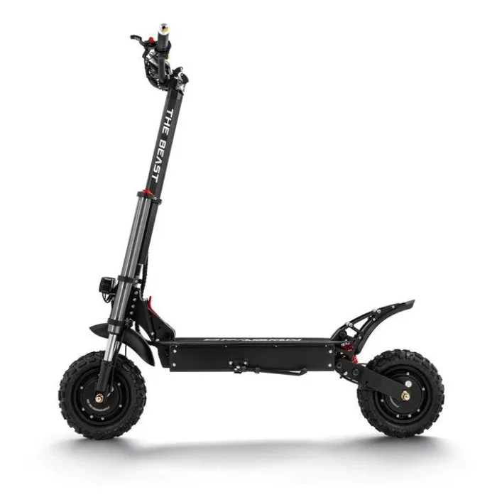 The Wolf Warrior X GT electric scooter is engineered to dominate both city streets and off-road paths with unmatched power, stability, and high-performance components. Equipped with dual 1100W BLDC motors and a 60V 28Ah LG battery, this beast of a machine reaches a top speed of 43.5 mph (70 km/h) and powers up hills at a 35-degree climb angle with ease.